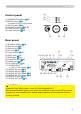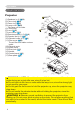 Part names Part names Projector (1) Speakers (x 4) (36). (2) Focus ring (18) (3) Zoom ring (18) (4) Lamp cover (52) The lamp unit is inside. (5) Front cover (6) Lens (56) (7) Lens cover (3) (8) Remote sensors (x 3) (14) (9) Elevator feet (x 2) (9) (10) Elevator knobs (x 2) (9) (11) F ilter cover (54) The air filter and intake vent are inside.