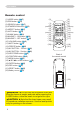 Part names Remote control (1) VIDEO button (17) (2) RGB button (16) (3) SEARCH button (17) (4) STANDBY/ON button (15) (5) ASPECT button (17) (6) AUTO button (18) (7) BLANK button (21) (8) MAGNIFY - ON button (20) (9) MAGNIFY - OFF button (20) (10) VOLUME button (16) (11) MUTE button (16) (12) FREEZE button (20) (13) MY BUTTON - 1 button (43) (14) MY BUTTON - 2 button (43) (15) KEYSTONE button (19) (16) POSITION button (19) (17) MENU button (22) (18) ▲/▼/◄/► cursor buttons (22) (19) ENTER
