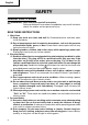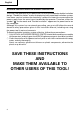 English SAFETY GENERAL SAFETY RULES WARNING: Read and understand all instructions. Failure to follow all instructions listed below, may result in electric shock, fire and/or serious personal injury. SAVE THESE INSTRUCTIONS 1. Work Area (1) Keep your work area clean and well lit. Cluttered benches and dark areas invite accidents. (2) Do not operate power tools in explosive atmospheres, such as in the presence of flammable liquids, gases, or dust.