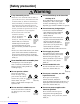[Safety precaution] Warning If any abnormality occurs. Do not look directly at the lens when • When there is an abnormal smell or smoke, if you use this unit as it is, this could cause a fire or electric shock, etc. When an abnormality is found, immediately turn off the power switch and pull out the power plug from the power the lamp is lit. Do not look directly at the lens when the lamp is lit. Since a strong light is used, it could damage you vision, etc.