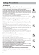 6DIHW\ 3UHFDXWLRQV FRQWLQXHG :$51,1* %H FDUHIXO LQ KDQGOLQJ WKH OLJKW VRXUFH ODPS 7KH SURMHFWRU XVHV D KLJK SUHVVXUH PHUFXU\ JODVV ODPS PDGH RI JODVV 7KH ODPS FDQ EUHDN ZLWK D ORXG EDQJ RU EXUQ RXW :KHQ WKH EXOE EXUVWV LW LV SRVVLEOH IRU VKDUGV RI JODVV WR IO\ LQWR WKH ODPS KRXVLQJ DQG IRU JDV FRQWDLQLQJ PHUFXU\ WR HVFDSH IURP WKH SURMHFWRU¶V YHQW KROHV 3OHDVH FDUHIXOO\ UHDG WKH VHFWLRQ ³/DPS´ %H FDUHIXO LQ KDQGOLQJ WKH SRZHU FRUG DQG H[WHUQDO