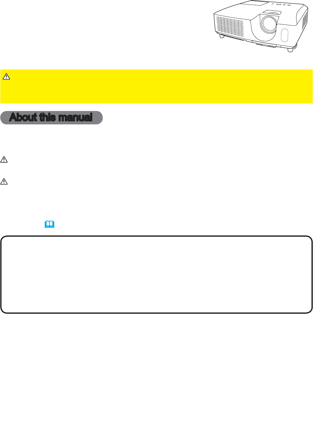 Projector CP-X2015WN/CP-X2515WN/CP-X3015WN/ CP-X4015WN/CP-WX2515WN/CP-WX3015WN User's Manual (detailed) Operating Guide Thank you for purchasing this projector. WARNING ►Before using this product, please read all manuals for this product. Be sure to read Safety Guide first. After reading them, store them in a safe place for future reference. About this manual Various symbols are used in this manual. The meanings of these symbols are described below.