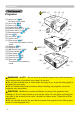 Part names Part names HOT! (1) Projector (1) Lamp cover (&60) The lamp unit is inside. (2) Focus ring (&18) (3) Zoom ring (&18) (4) Control panel (&5) (5) Elevator buttons (x 2) (&18) (6) Elevator feet (x 2) (&18) (7) Remote sensor (&13) (8) Lens (&65) (9) Lens cover (&3) (10) Intake vents (11) Filter cover (&62) The air filter and intake vent are inside.