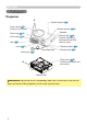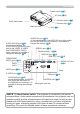Part names Part names Projector Ì Control buttons ( 6) Lamp cover ( 51) (Lamp unit is inside.) Remote sensor ( 16) Speaker Zoom ring ( 19) Security bar ( 10) (Use for attaching a commercial anti-theft chain or wire.) Focus ring ( 19) Vent ( 7) Elevator button ( 9) Lens ( 17) Front-Right side Elevator foot ( 9) Lens cover ( 3) Filter cover ( 52) $LU ¿OWHU DQG LQWDNH YHQW are inside.