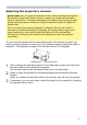 Setting up Setting up WARNING ŹPlace the projector in a stable position horizontally. A fall or a turnover could cause an injury and/or damage to the projector. Then using GDPDJHG SURMHFWRU FRXOG UHVXOW LQ D ¿UH DQG RU DQ HOHFWULF VKRFN • Do not place the projector on an unstable, slant or vibrant surface such as a wobbly or inclined stand.