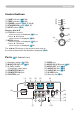 Part names Control buttons (1) LAMP indicator (&65, 66) (2) TEMP indicator (&65, 66) (3) POWER indicator (&16, 17, 65, 66) (4) STANDBY/ON button (&16, 17) (5) INPUT button (&18) (1) (2) (3) POWER STANDBY/ON (4) Buttons ◄/►/▲/▼ (6) FOCUS +/- buttons when no menu is displayed (&21), or Cursor ◄, ► buttons when a menu is displayed (&24). (7) MENU buttons when no menu is displayed (&24), or Cursor ▲, ▼ buttons when a menu is displayed (&24).