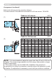 Setting up Arrangement (continued) Refer to the following for the projection distance. The values shown in the table are calculated for a full size screen: 1024x768. Table for 4:3 screen (1) A A C2 C1 B1 B2 B1 B2 inch cm inch cm inch 48 * 0.5 *(0.2) 38.3 15 50 2.0 1 39.8 16 60 9.6 4 47.4 19 70 17.2 7 55.0 22 80 24.8 10 62.6 25 90 32.4 13 70.2 28 100 39.9 16 77.7 31 120 55.0 22 92.8 37 150 77.7 31 115.5 45 200 115.5 45 153.3 60 (±8%) C1 cm inch 24.4 10 25.2 10 28.9 11 32.6 13 36.2 14 39.9 16 43.