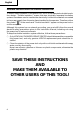 English SAFETY GENERAL SAFETY RULES WARNING: Read and understand all instructions. Failure to follow all instructions listed below, may result in electric shock, fire and/or serious personal injury. SAVE THESE INSTRUCTIONS 1. Work Area (1) Keep your work area clean and well lit. Cluttered benches and dark areas invite accidents. (2) Do not operate power tools in explosive atmospheres, such as in the presence of flammable liquids, gases, or dust.