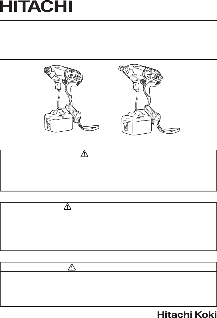 English IMPORTANT SAFETY INSTRUCTIONS FOR USE OF THE BATTERY AND BATTERY CHARGER You must charge the battery before you can use the cordless impact wrench. Before using the model UC14YF2 or UC14YFA battery charger, be sure to read all instructions and cautionary statements on it, the battery and in this manual. REMEMBER: USE ONLY HITACHI BATTERY TYPES EB7 SERIES, EB9 SERIES, EB12 SERIES, EB14 SERIES.