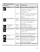 LED Display Status Indicators Color Indication Red Out of ribbon or there is problem with the ribbon (not feeding or loaded incorrectly). Off Ribbon is good or the printer is not configured to use ribbon. Red The printhead is too hot. Off The printhead temperature is normal and ready for printing. Printhead Lifted Red Printhead is lifted. Off Printhead is lowered. General Error Red There is printer problem not associated with any of the other icons. Off There are no general errors.