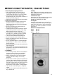 CONTENTS QUICK REFERENCE GUIDE PROGRAMME CHART PREPARING THE LAUNDRY SELECTING A PROGRAMME AND OPTIONS STARTING AND COMPLETING A PROGRAMME CHANGING A PROGRAMME INTERRUPTING A PROGRAMME DAILY MAINTENANCE AND CLEANING INSTRUCTIONS FOR USE BOOKLET 12 BEFORE USING THE DRYER / CONNECTIONS PAGE 13 PRECAUTIONS AND GENERAL RECOMMENDATIONS PAGE 14 DESCRIPTION OF THE DRYER PAGE 15 DRAINAGE SYSTEM PAGE 16 DOOR REVERSIBILITY / CHILD SAFETY LOCK PAGE 17 HEAT EXCHANGER PAGE 18 TROUBLESHOOTING GUIDE /