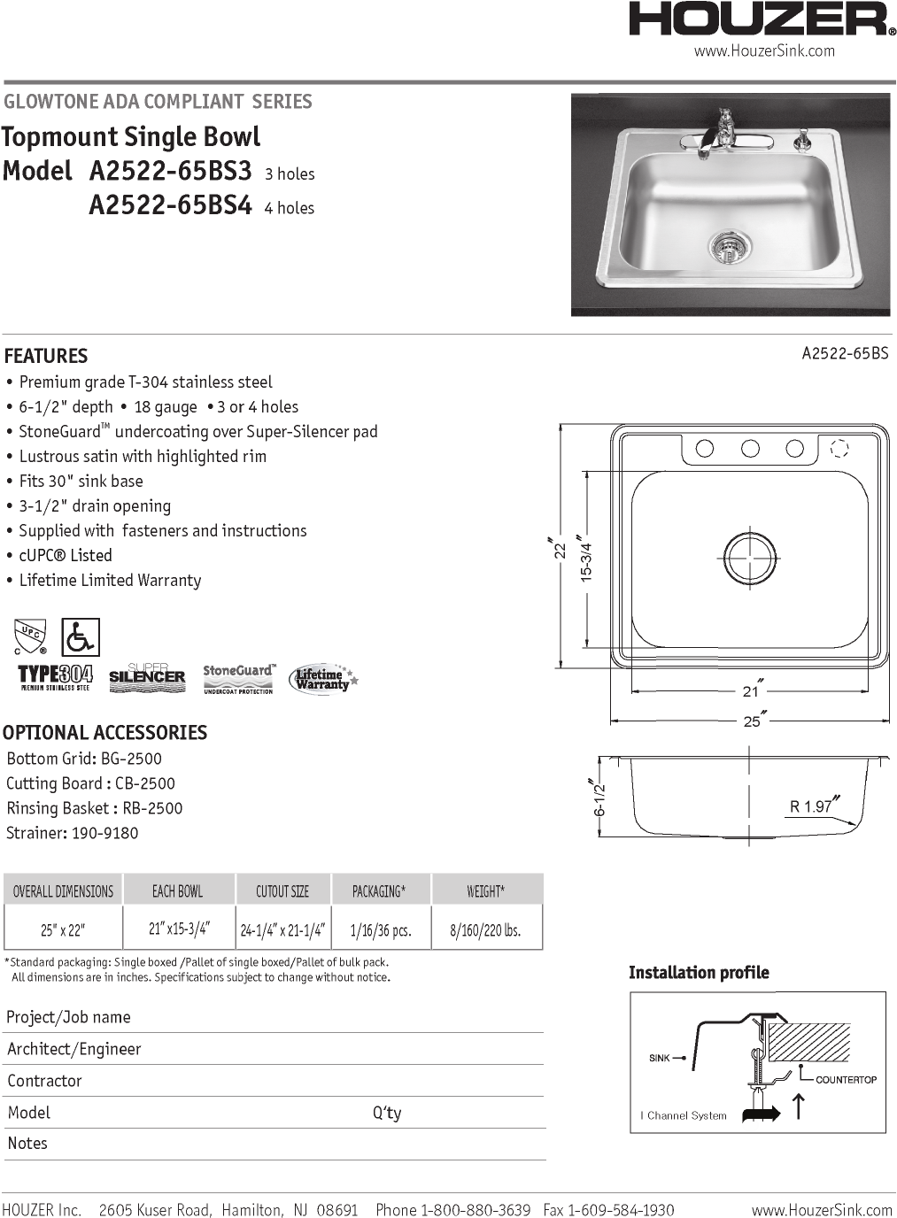 Glowtone® Top Mount 25" Stainless Steel 3-Hole Single Bowl Kitchen Sink