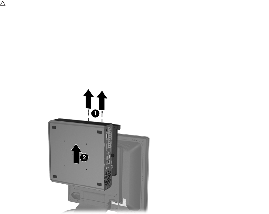 4. Remove the two screws from the top of the computer mounting bracket (1) and slide the computer