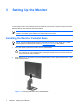 NOTE Be sure the pedestal base is securely locked before continuing with the setup. Rear Components Figure 3-2 Rear Components Component ENWW Function 1 Cable Lock Provision Provides slot for use with cable security locks. 2 Master Power Switch Turns off all power to the monitor. 3 AC Power Connector Connects the AC power cord to the monitor. 4 DVI-D Connectors Connects the DVI-D signal cable to the monitor. 5 USB Upstream Connector Connects the monitor USB hub to a host USB port/hub.