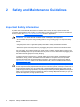 2 Safety and Maintenance Guidelines Important Safety Information A power cord is included with the monitor. If another cord is used, use only a power source and connection appropriate for this monitor. For information on the correct power cord set to use with the monitor, refer to the Power Cord Set Requirements section in Appendix C. WARNING! To reduce the risk of electric shock or damage to the equipment: • Do not disable the power cord grounding feature.