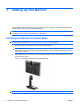 Connecting USB Devices The monitor provides USB connectors on the side panel and on the rear panel that can be used to connect devices such as a digital camera, USB keyboard, or USB mouse. NOTE: You must connect the USB hub cable from the monitor to the computer to enable the USB 2.0 ports on the monitor. Refer to Step 5 in Routing and Connecting the Cables on page 6. Figure 3-6 Connecting USB Devices Adjusting the Monitor 1.