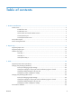 7 ENWW Manage and maintain ● Use the HP Reconfiguration Utility to change the product connection ● Set up HP Wireless Direct Printing ● Use HP Web Services applications ● Configure IP network settings ● HP Device Toolbox (Windows) ● HP Utility for Mac OS X ● HP Web Jetadmin ● Product security features ● Economy settings ● Print when a toner cartridge is at estimated end of life ● Store and recycle supplies ● Replacement instructions ● Memory ● Update the firmware 129