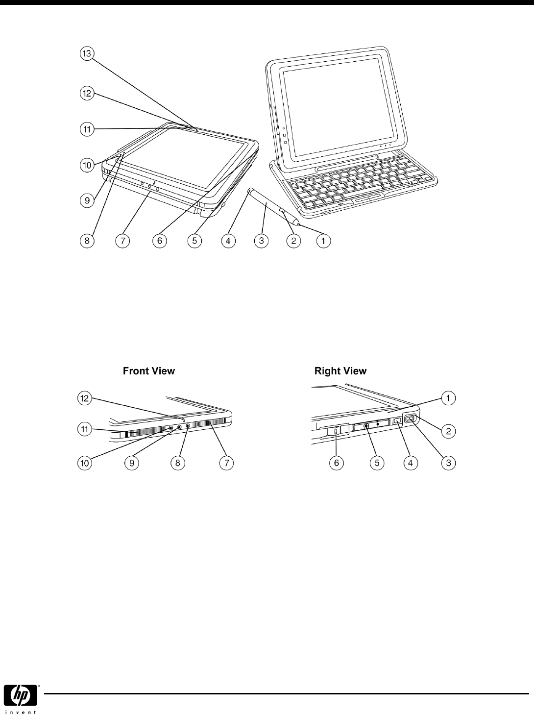 QuickSpecs HP Compaq Tablet PC TC1100 Overview 1. 2. 3. 4. 5. 6. 7. Pen Tip Pen Button Pen Barrel Pen Tether Eyelet Battery Bay Power Switch Mobile Keyboard (attached) 8. 9. 10. 11. 12. 13. AC Adapter Light Battery Light Wireless LAN/Bluetooth Activity Light Tablet PC Input Panel Launch Journal Launch Button Rotate Button 1. 2. 3. 4. 5. 6. Integrated Antenna Power Switch Power/Standby Light Display Toggle (F4) Button Windows Security Button (CTRL+ALT+DEL) Jog Dial 7. 8. 9. 10. 11. 12.