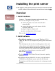 Steps to install the print server hardware 1. Attach the print server to a 10Base-T (Ethernet) or 100Base-TX (Fast Ethernet) local area network by plugging a network cable into the RJ-45 connector on the rear end of the print server. 2. Attach the print server to the printer by plugging the Universal Serial Bus (USB) cable—shipped with the print server—into the USB connector on the front end of the print server and into the USB connector on the printer.