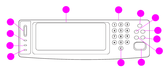 The control panel includes a touch-screen graphical display, job-control buttons, a numeric