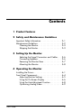 Contents 1 Product Features 2 Safety and Maintenance Guidelines Important Safety Information Maintenance Guidelines . . . Cleaning the Monitor. . . Shipping the Monitor . . . . . . . . . . . . . . . . . . . . . . . . . . . . . . . . . . . . . . . . . . . . . . . . . . . . . . . . . . . . . . . . . . . 2–1 2–2 2–3 2–3 Selecting the Signal Connectors and Cables. Connecting Speakers. . . . . . . . . . . . . . . . . Removing the Monitor Base . . . . . . . . . . . . Mounting the Monitor . . . .