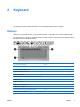 2 Keyboard The following sections provide information on the keyboard features of the computer. Hotkeys Hotkeys are combinations of the fn key (1) and either the esc key (2) or one of the function keys (3). The icons on the f1 through f12 keys represent the hotkey functions. Hotkey functions and procedures are discussed in the following sections. ENWW To perform this function Press Display system information. fn+esc Open the Help and Support Center. fn+f1 Open the Print Options window.