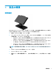 外部電源アダプターの電源への接続 外部電源アダプターを I/O 接続ベースに接続するには、電源コードの一方の端を外部電源アダプター に接続し(1)、もう一方の端をアース(接地)された電源コンセントに接続して(2)、外部電源アダ プターを I/O 接続ベースの電源コネクタに接続します(3)。 外部電源アダプターが I/O 接続ベースに接続されていないときに、外部電源アダプターをコンピュー ターに接続するには、外部電源アダプターをアースされた電源コンセントに接続して(1)、外部電源 アダプターの USB Type-C ポートをスタンドまたはスタビリティ ベースの底面にある USB Type-C 電源 ポートに接続します(2)。 注記:以下の図では、スタビリティ ベースが取り付けられています。 6 第 1 章 製品の概要