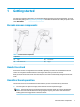 1 Getting started For safety and regulatory information, see the Product Notices provided in your documentation kit. To access the latest user guide, go to http://www.hp.com/support and follow the instructions to find your product. Then select User Guides. Barcode scanner components Table 1-1 Barcode scanner components Components (1) Light (3) Scan window (2) Cable release hole (4) Trigger Hands-free stand A hands-free stand or an integrated stand is available, depending on model.