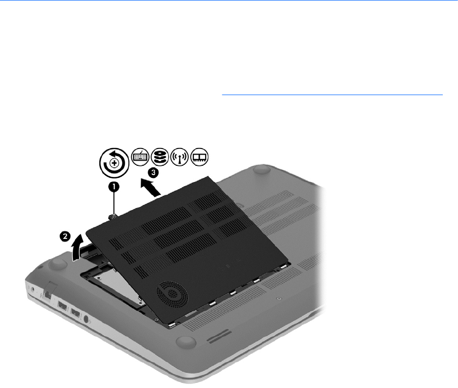 1. Loosen the service door screw (1), lift the service door (2), and then remove it (3).