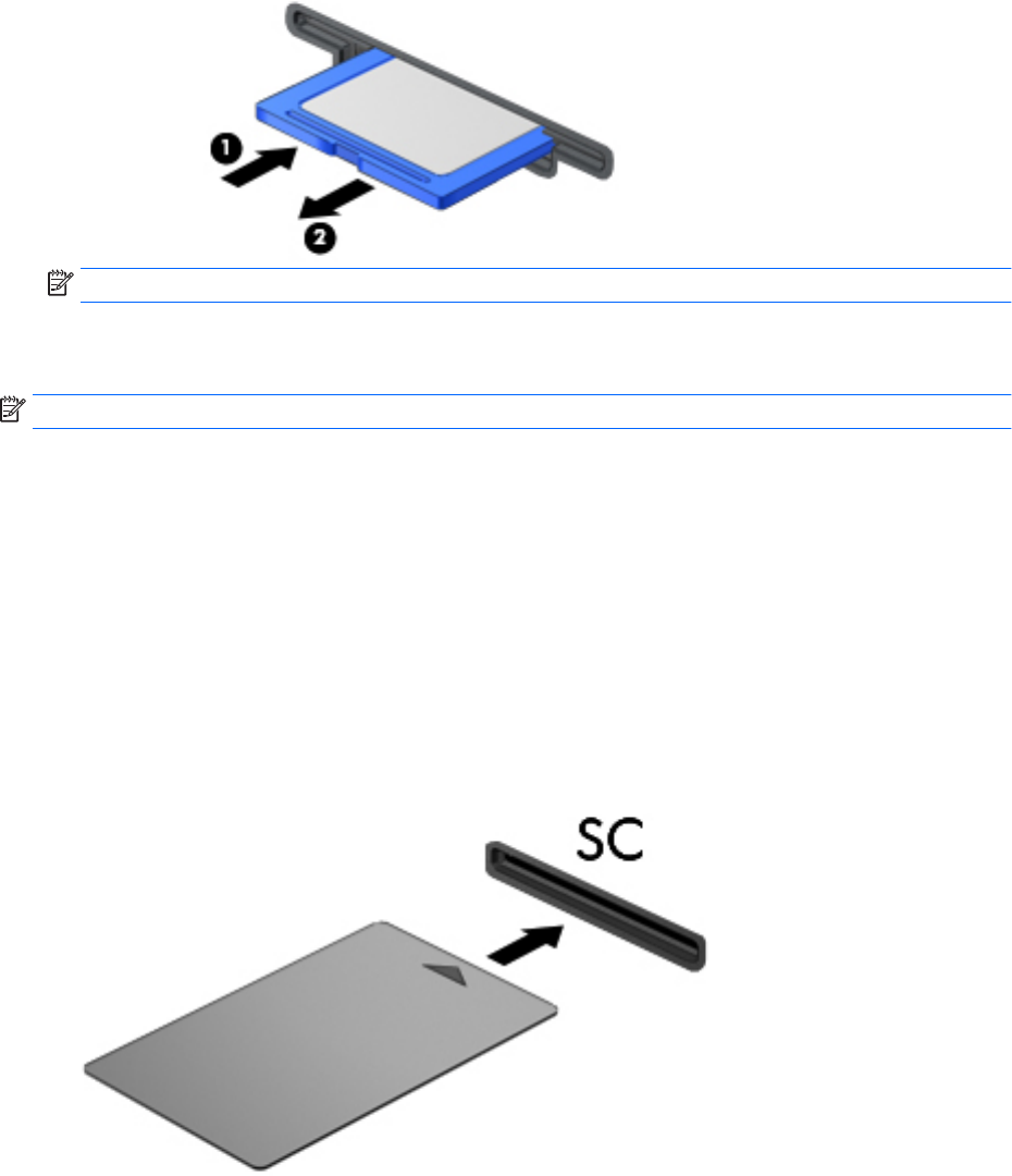 3. Druk de kaart iets naar binnen (1) en verwijder deze vervolgens uit het slot (2).