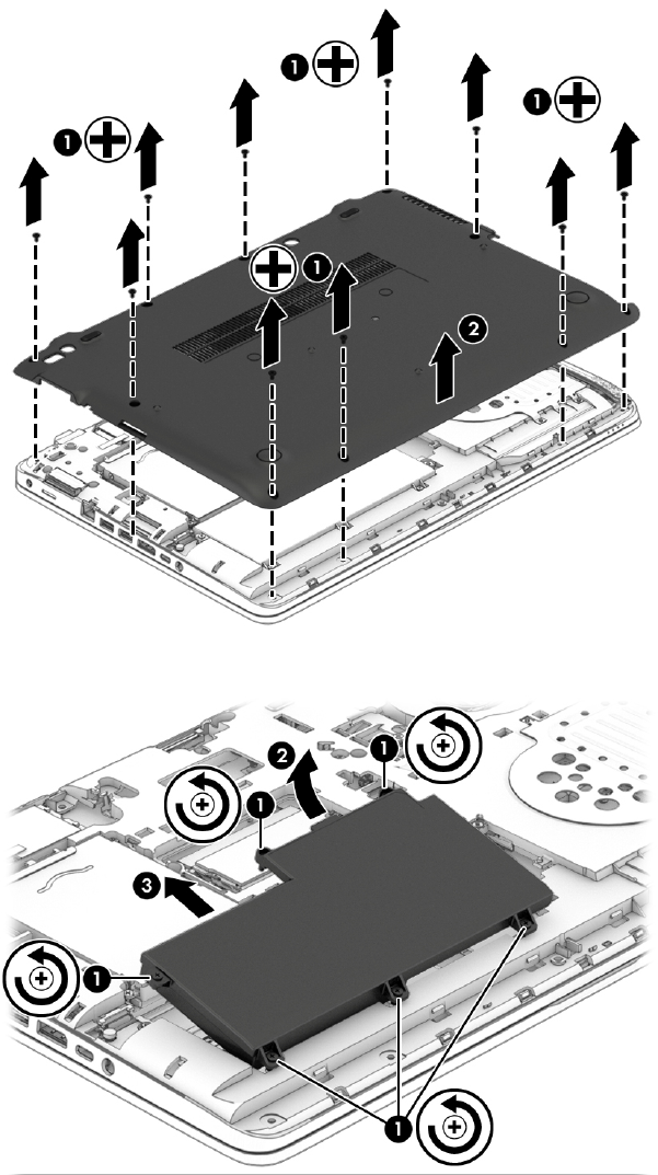 3. Lösen Sie 6 unverlierbare Schrauben (1) und heben Sie dann den Akku heraus (2), um ihn zu entfernen.