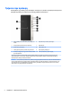 Τμήματα στην πρόσοψη Η διαμόρφωση της μονάδας μπορεί να διαφέρει, ανάλογα με το μοντέλο. Ορισμένα μοντέλα έχουν ένα κάλυμμα κενής θέσης που καλύπτει την υποδοχή μονάδας οπτικού δίσκου. 1 Θέση μονάδας δίσκου (πίσω από την πρόσοψη) 5,25 ιντσών 6 Θύρα USB 2.0 με HP Sleep and Charge* 2 Λεπτή μονάδα οπτικού δίσκου (προαιρετική) 7 Θύρα USB 2.0 3 Κουμπί διπλής λειτουργίας 8 Θύρες USB 3.