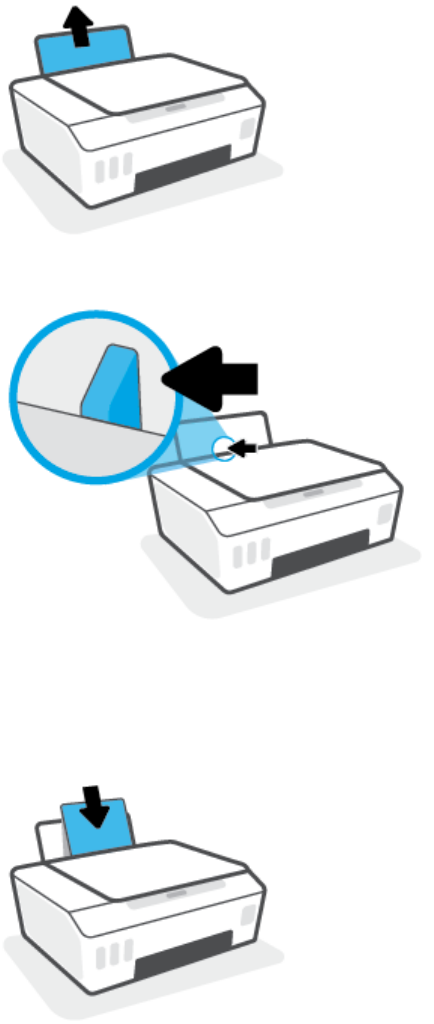 3. 用紙の短辺を下げ、印刷面を上にした状態で、用紙の束を給紙トレイに挿入し、奥まで差し込み