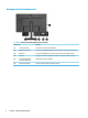 Aizmugurē izvietotie komponenti 1-2. tabula. Aizmugurē izvietotie komponenti un to apraksti 4 Komponents Apraksts (1) Strāvas savienotājs Šeit tiek pievienots maiņstrāvas adapteris. (2) DisplayPort savienotājs Ļauj pievienot DisplayPort kabeli avota ierīcei, piemēram, datoram vai spēļu konsolei. (3) HDMI ports Ļauj pievienot HDMI kabeli avota ierīcei, piemēram, datoram vai spēļu konsolei. (4) VGA ports Ļauj pievienot monitora VGA kabeli no monitora uz avota ierīci, piemēram, datoru.