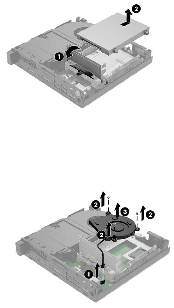 8. Jei jūsų kompiuterio modelis yra 65 W „EliteDesk 800“, išimkite papildomą ventiliatorių, esantį po