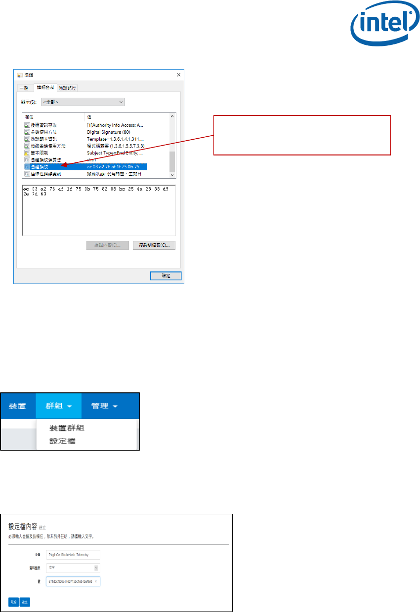 2. 按一下建立以建立遙測外掛程式憑證雜湊的金鑰,當設定檔內容 視窗開啟時,請