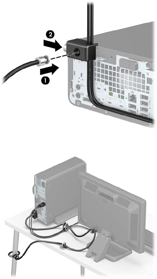 9. Sätt in kontaktänden av säkerhetskabeln i låset (1) och tryck in knappen (2) för att aktivera låset.