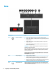 Komponenta Opis ● (8) Utičnica za audio izlaz (slušalice) Narandžasta: Aktivnost se pojavljuje na mreži. Povezuje opcionalne stereo zvučnike sa vanjskim napajanjem, slušalice, male slušalice, slušalice sa mikrofonom ili audio kabl za televizor. OPOMENA! Da biste smanjili rizik od povreda, podesite jačinu zvuka prije korištenja slušalica, slušalica bubica ili slušalica s mikrofonom. Dodatne sigurnosne informacije potražite u poglavlju Regulatorne, sigurnosne i napomene o zaštiti životne sredine.