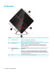 Pravá strana Súčasť (1) Popis Tlačidlo napájania ● Keď je počítač vypnutý, stlačením tohto tlačidla ho zapnete. ● Keď je počítač zapnutý, krátkym stlačením tohto tlačidla aktivujete režim spánku. ● Keď je počítač v režime spánku, krátkym stlačením tohto tlačidla ukončíte režim spánku. ● Keď je počítač v režime dlhodobého spánku, krátkym stlačením tohto tlačidla ukončíte režim dlhodobého spánku. UPOZORNENIE: Stlačenie a podržanie tlačidla napájania spôsobí stratu neuložených údajov.