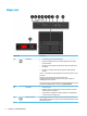Höger sida Komponent (1) Beskrivning Strömknapp ● Slå på datorn genom att trycka på knappen. ● När datorn är påslagen aktiverar du strömsparläget genom att snabbt trycka på knappen. ● När datorn är i strömsparläge avslutar du detta genom att snabbt trycka på knappen. ● När datorn är i viloläge avslutar du detta genom att snabbt trycka på knappen. VIKTIGT: Om du håller ned strömknappen förlorar du all information som inte har sparats.