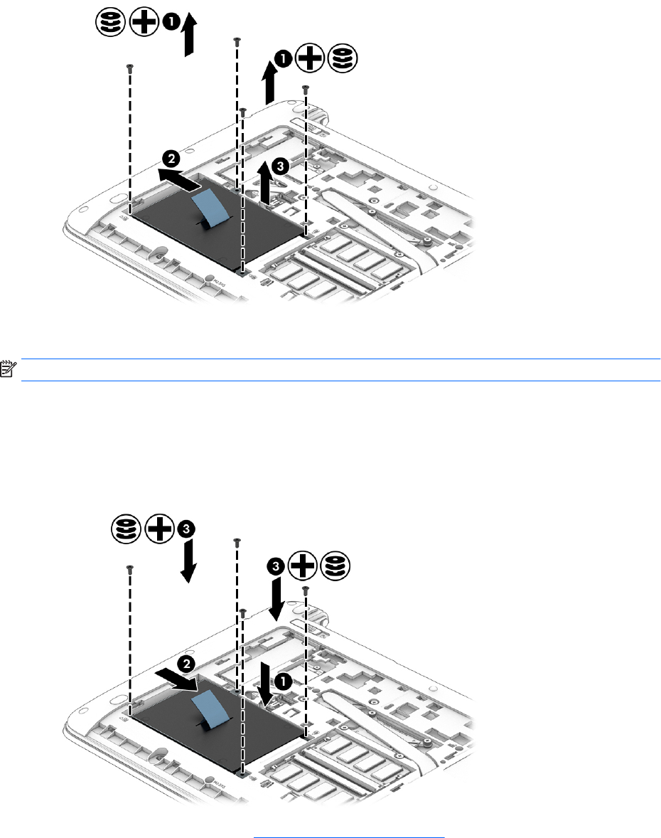6. Keerake lahti kõvaketta 4 kruvi (1). Kõvaketta eemaldamiseks tõmmake kettal olevat lapatsit (2) arvuti