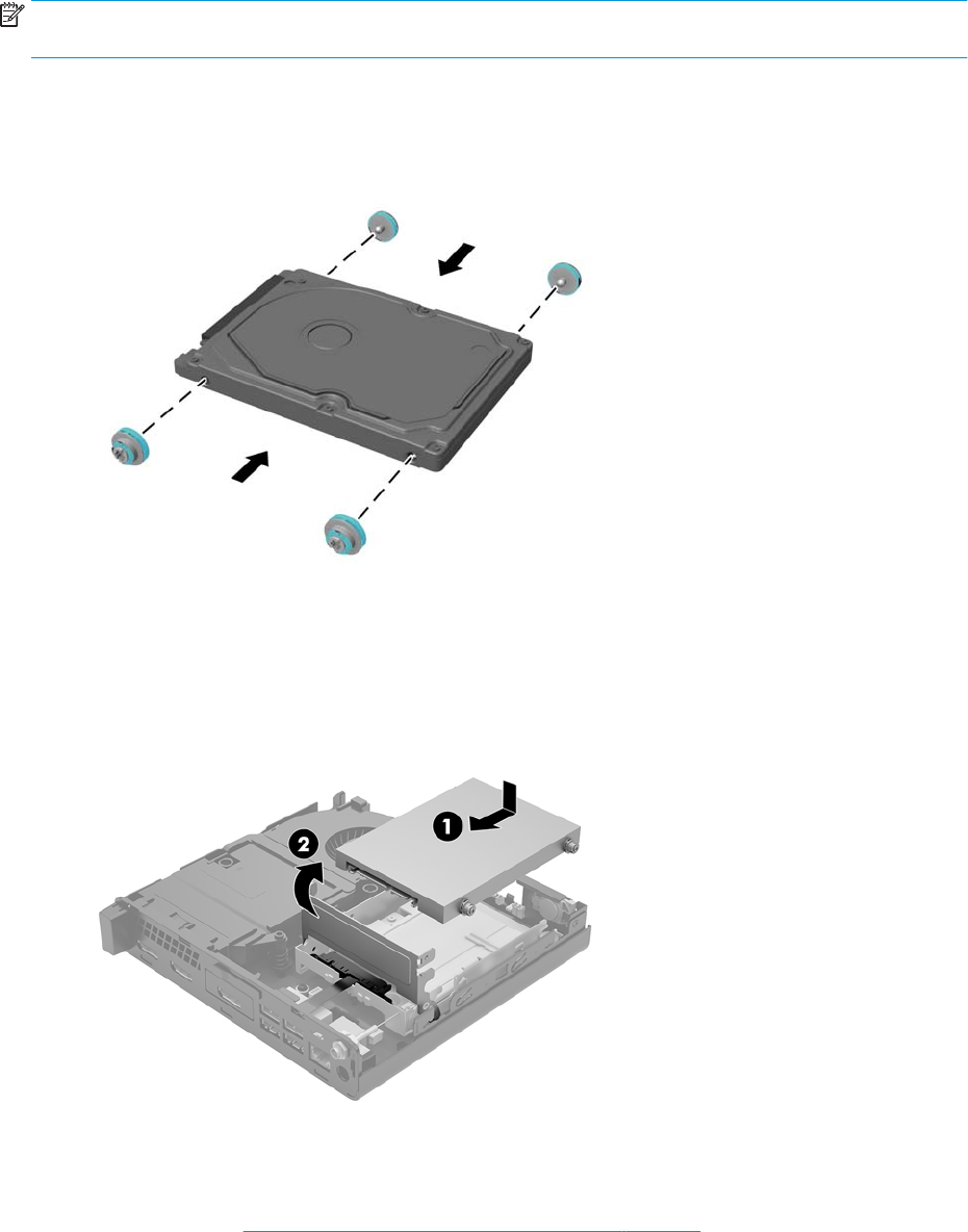 2. Illessze a merevlemez tartócsavarjait a meghajtórekesz nyílásaihoz, nyomja be a meghajtót a rekeszbe,