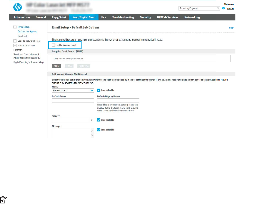 8. On the Email Setup page, select the Enable Scan to Email check box. If this check box is not available, the