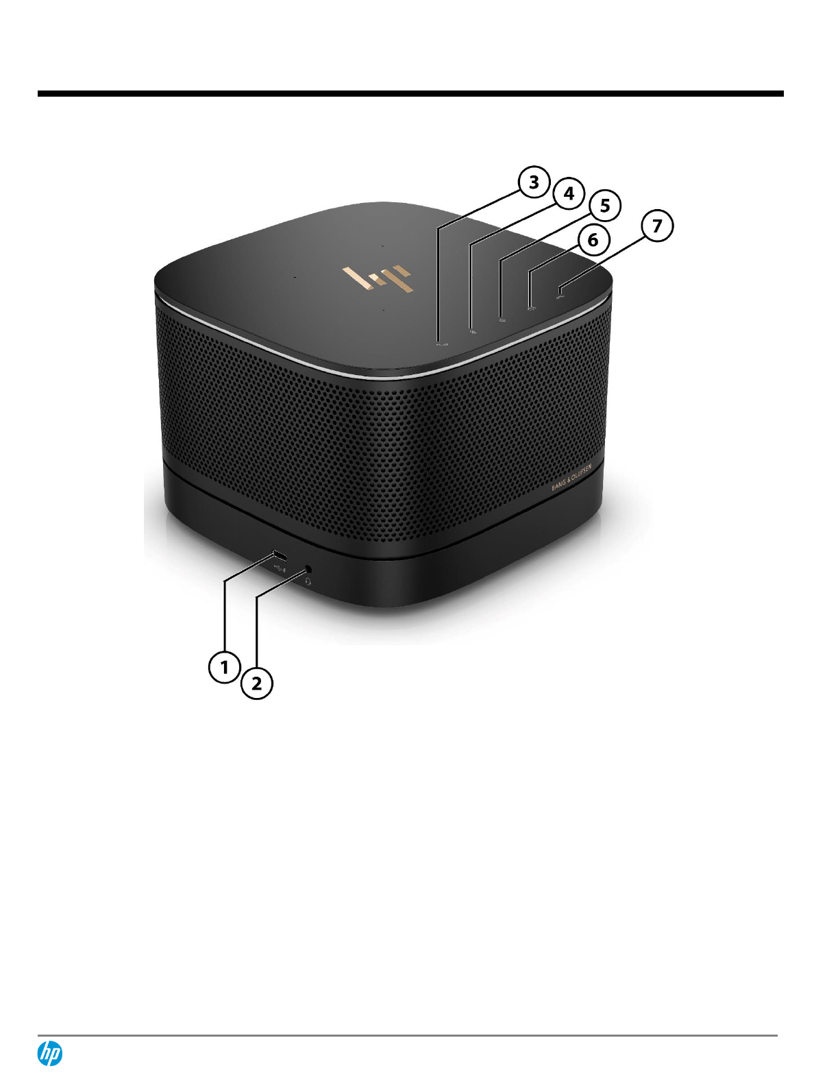 QuickSpecs HP Elite Slice for Meeting Rooms G2 for Skype Room Systems Technical Specifications HP Elite Slice for Meeting Rooms G2 for Skype Room Systems 1. 2. 3. 4. Side Ports/Collaboration buttons USB Type-C™ 3.1 Gen 1 USB port 5. Volume down Audio-out (headphone)/audio-in (microphone) 6. Volume up Call 7. Hang up Mute Not all configuration components are available in all regions/countries.