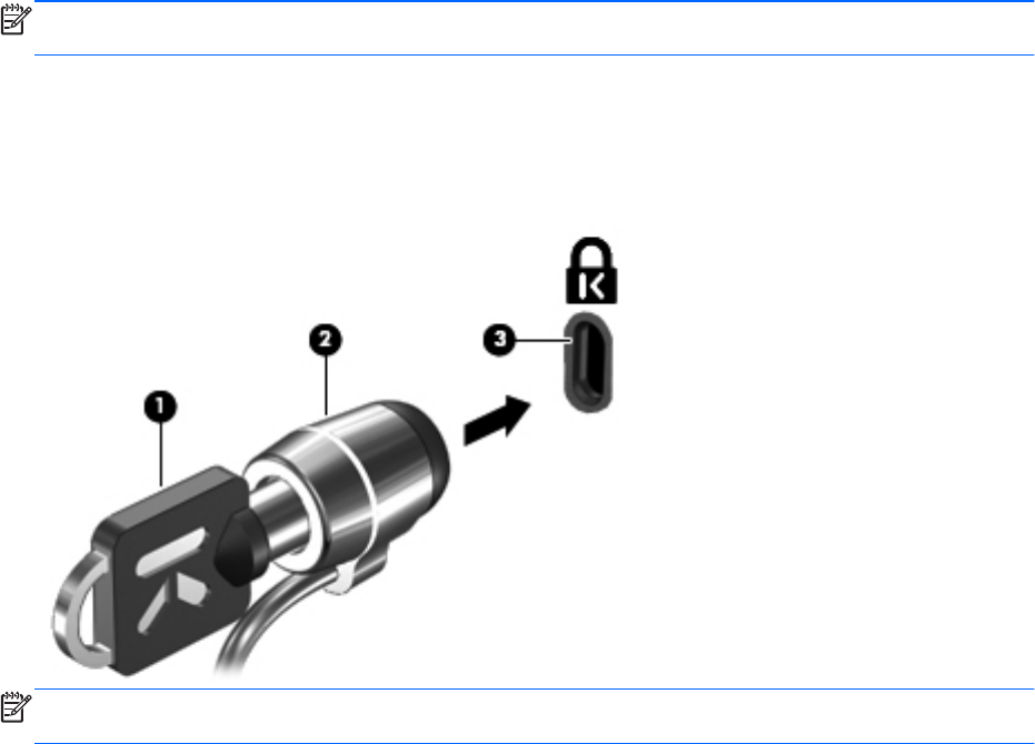 3. Insert the cable lock into the security cable slot on the computer (3), and then lock the cable lock