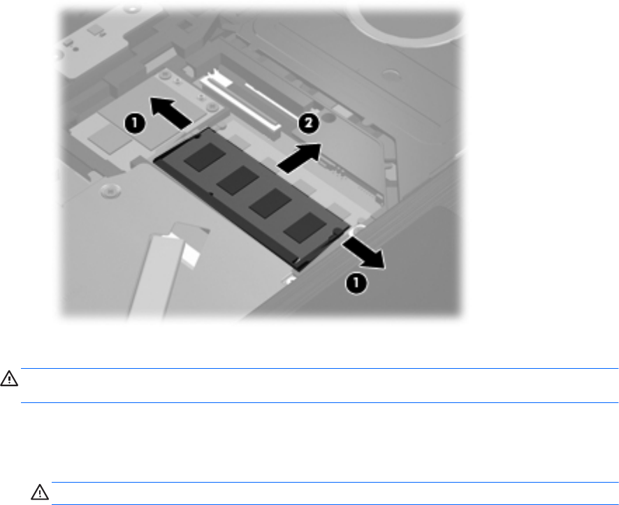 b. Grasp the edge of the memory module (2), and gently pull the module out of the memory