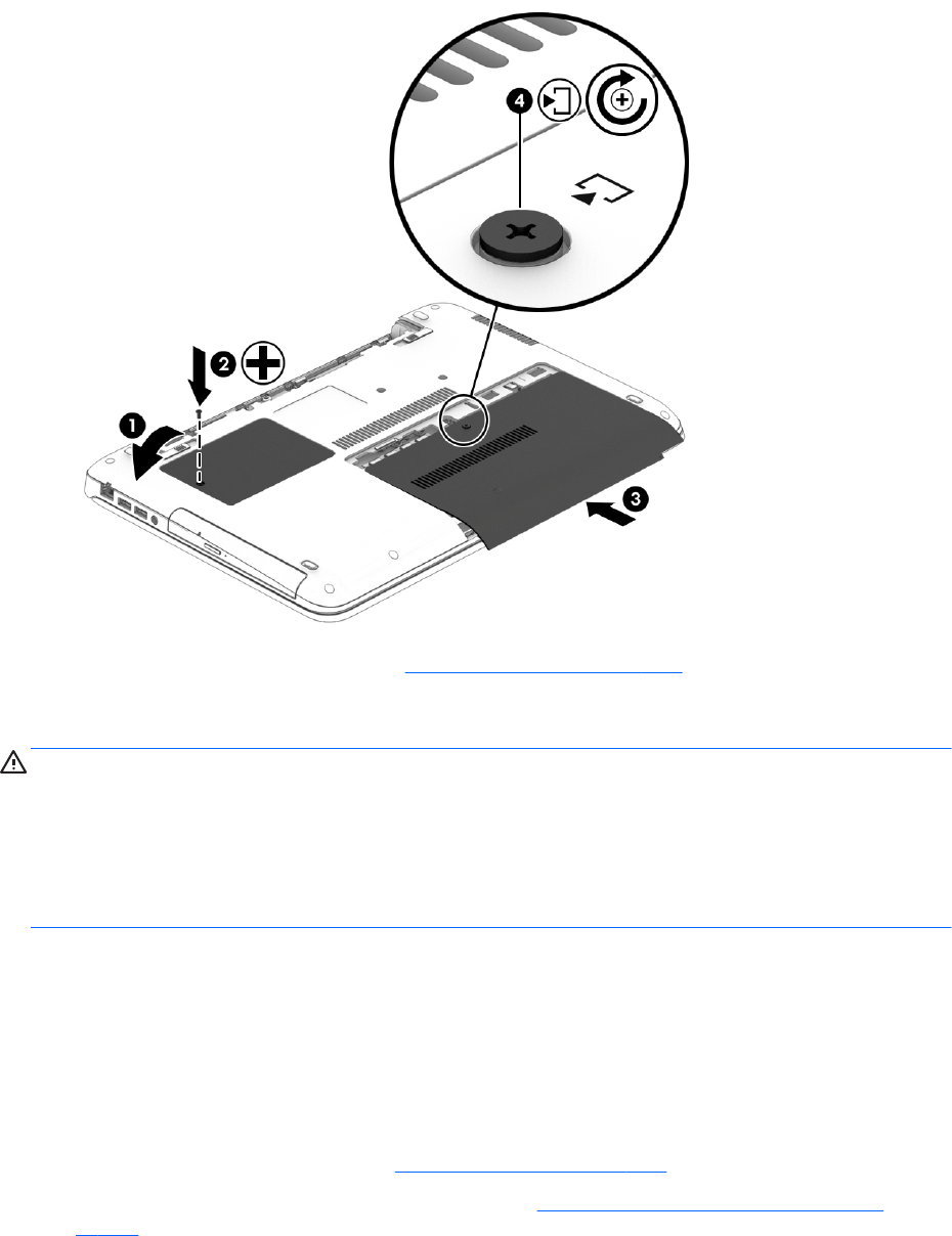 4. Pievelciet lielākā apkopes nodalījuma pārsega skrūvi (4), lai nostiprinātu apkopes nodalījuma pārsegu.