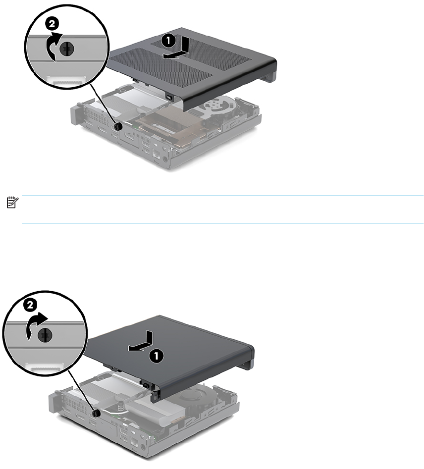 d. Wenn die Zugangsabdeckung eingerastet ist, ziehen Sie die Rändelschraube an (2), um die