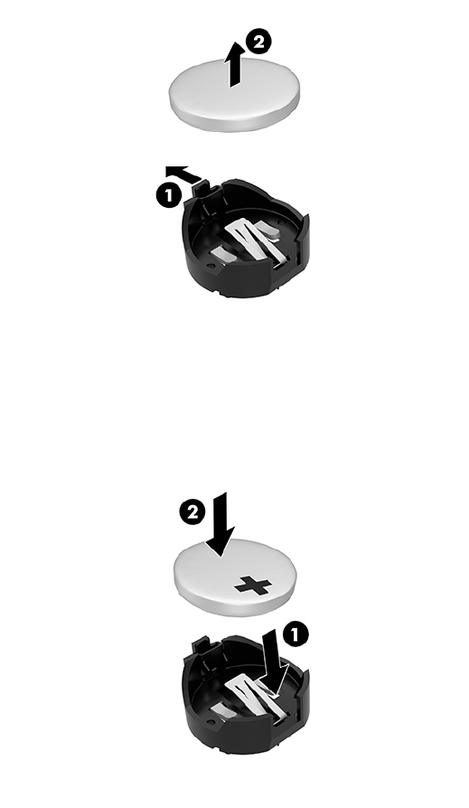 Metallklammer (1). Nachdem sich die Batterie gelöst hat, nehmen Sie diese heraus (2).