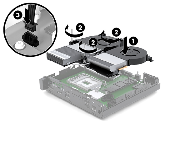 c. Conectaţi ansamblul ventilatorului la placa de sistem (3).